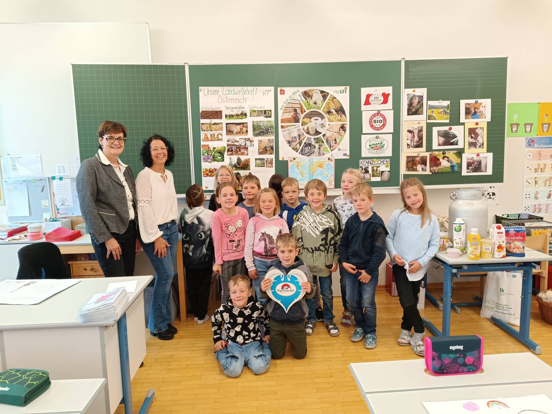 Vor Kurzem besuchten zwei Seminarbäurinnen die erste Schulstufe, um den Kindern die Arbeit der Bäurinnen und Bauern näherzubringen. In einem anschaulichen Vortrag erklärten sie, welche Aufgaben es auf einem Bauernhof gibt und wie wichtig Landwirtschaft für unsere Ernährung ist. Besonders interessiert zeigten sich die Schülerinnen und Schüler an den Erzählungen über die Tiere am Bauernhof – von der Kuh bis zum Huhn.