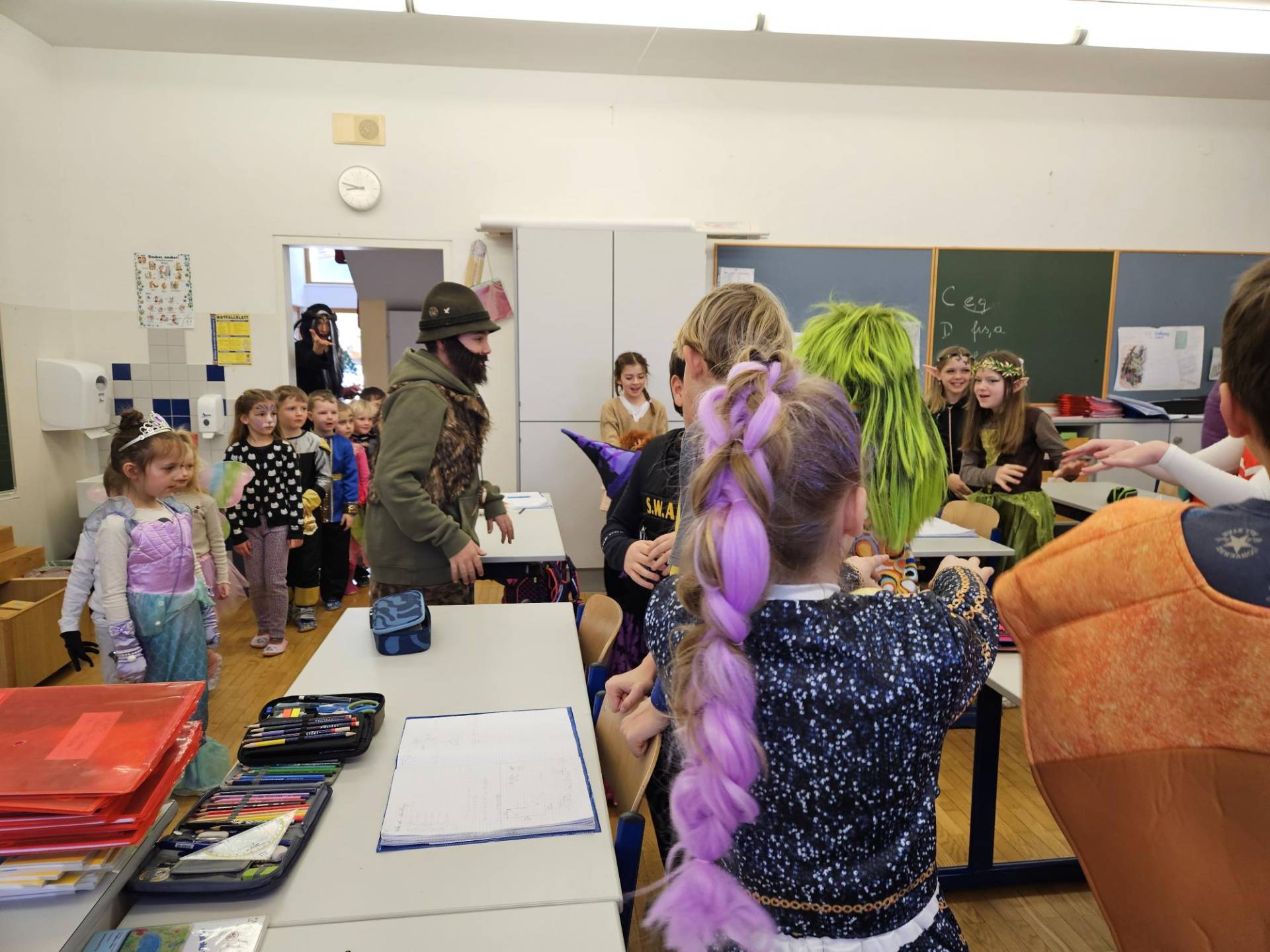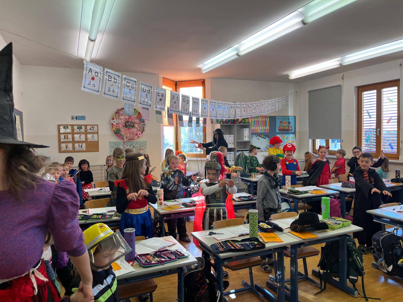 Auch die Kindergartenkinder statteten allen Klassen einen fröhlichen Besuch ab. Gemeinsam wurde das „Gute-Laune-Lied“ gesungen und getanzt – ein riesiger Spaß für Groß und Klein!