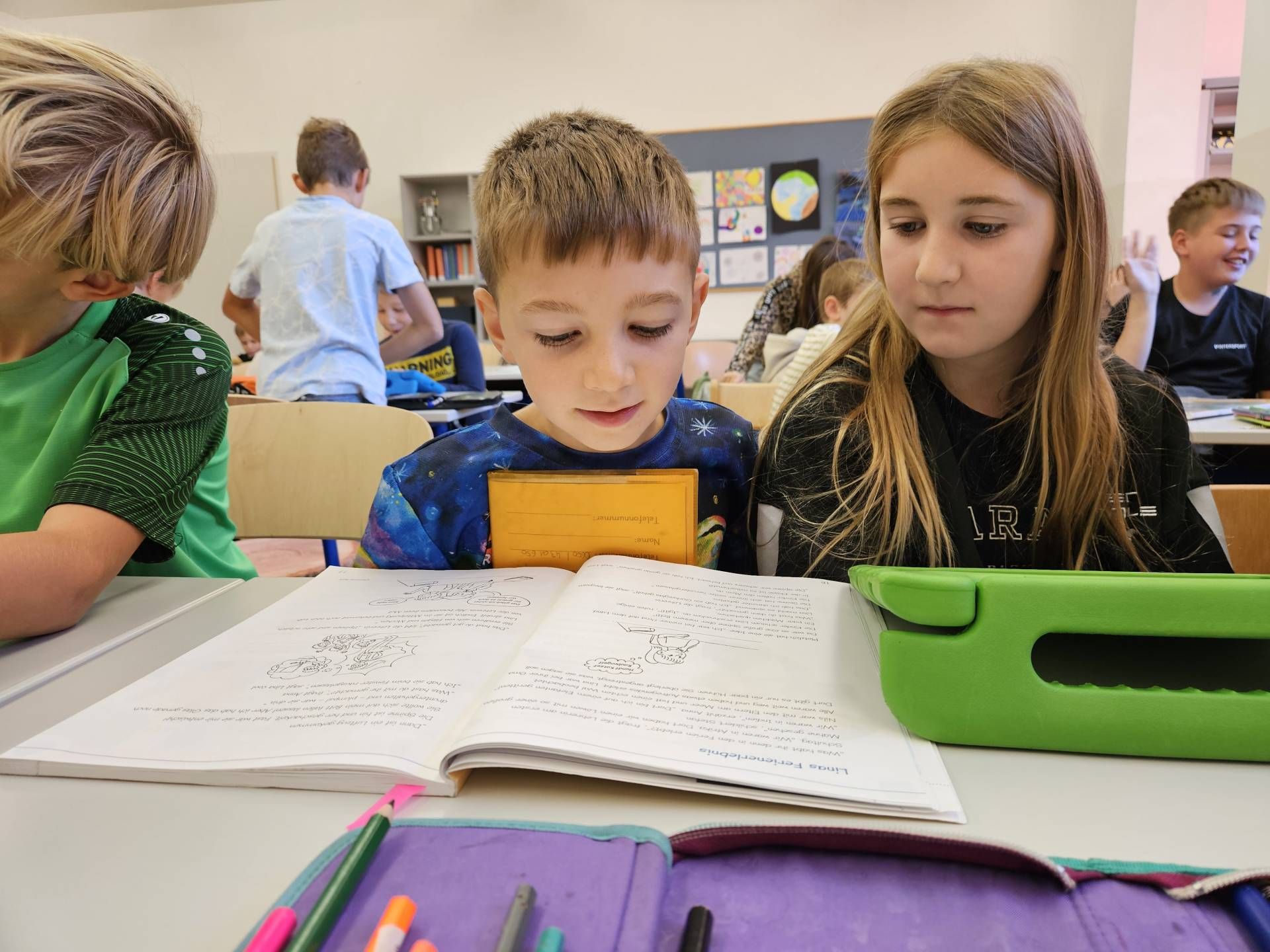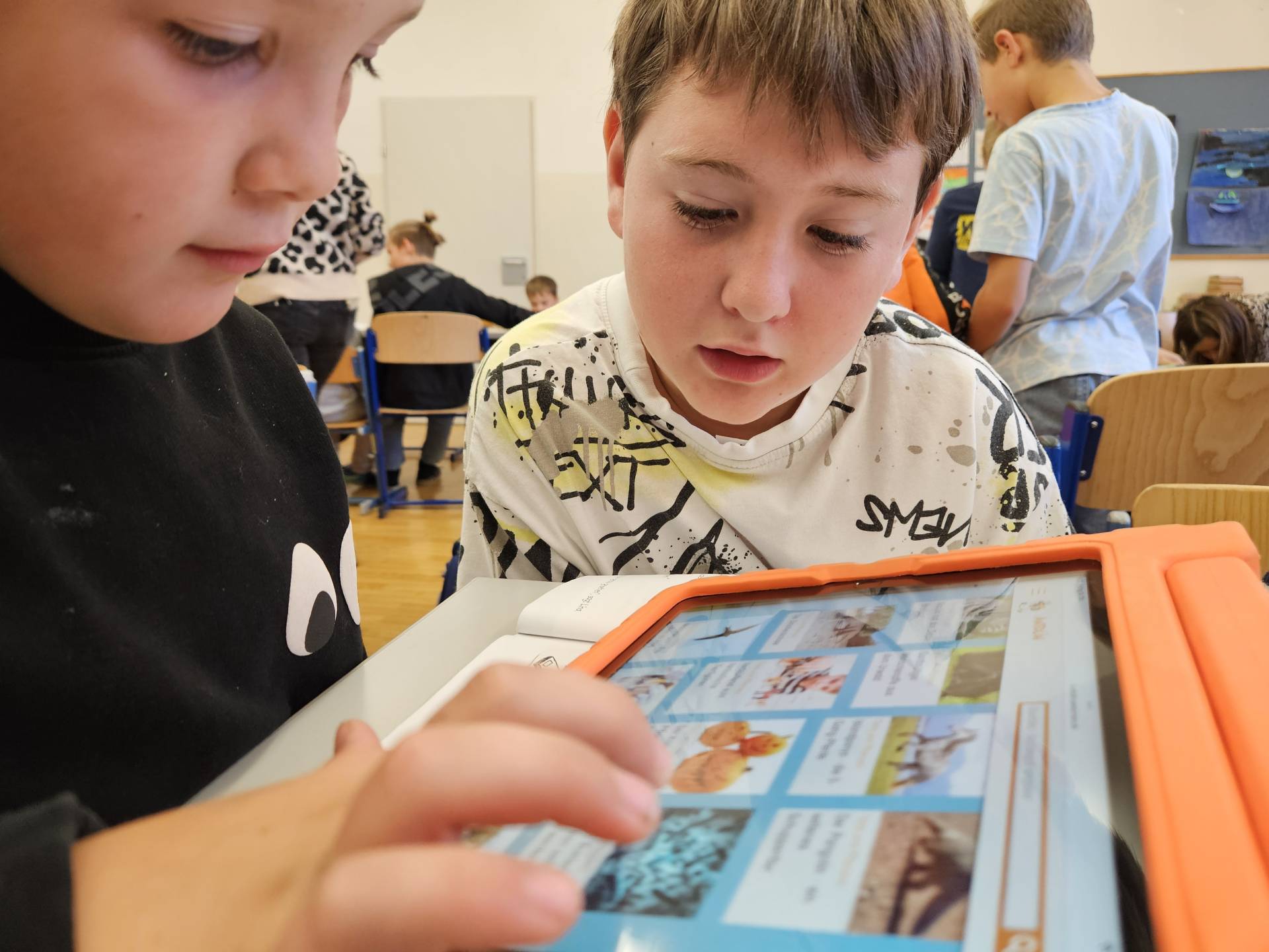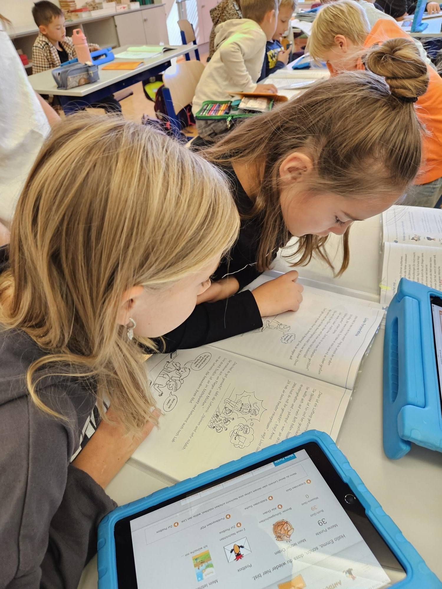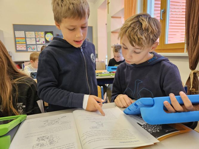 Die Schülerinnen und Schüler der 2. und 4. Klasse arbeiten derzeit gemeinsam mit dem Leseförderprogramm ANTOLIN. Dieses digitale Leseförderprogramm bietet Quizfragen zu über 120.000 Kinder- und Jugendbüchern sowie zu Sachtexten.  Die Kinder der 2. Klasse unterstützen dabei ihre älteren Mitschülerinnen und Mitschüler aus der 4. Klasse, indem sie ihnen den Einstieg in das Programm und die Nutzung des „Postkorbs“ erklären. Nach dem Einloggen mit den persönlichen Zugangsdaten bearbeiten die Kinder Leseübungen aus dem Deutschbuch und absolvieren anschließend passende Quizfragen, um ihr Textverständnis zu überprüfen.