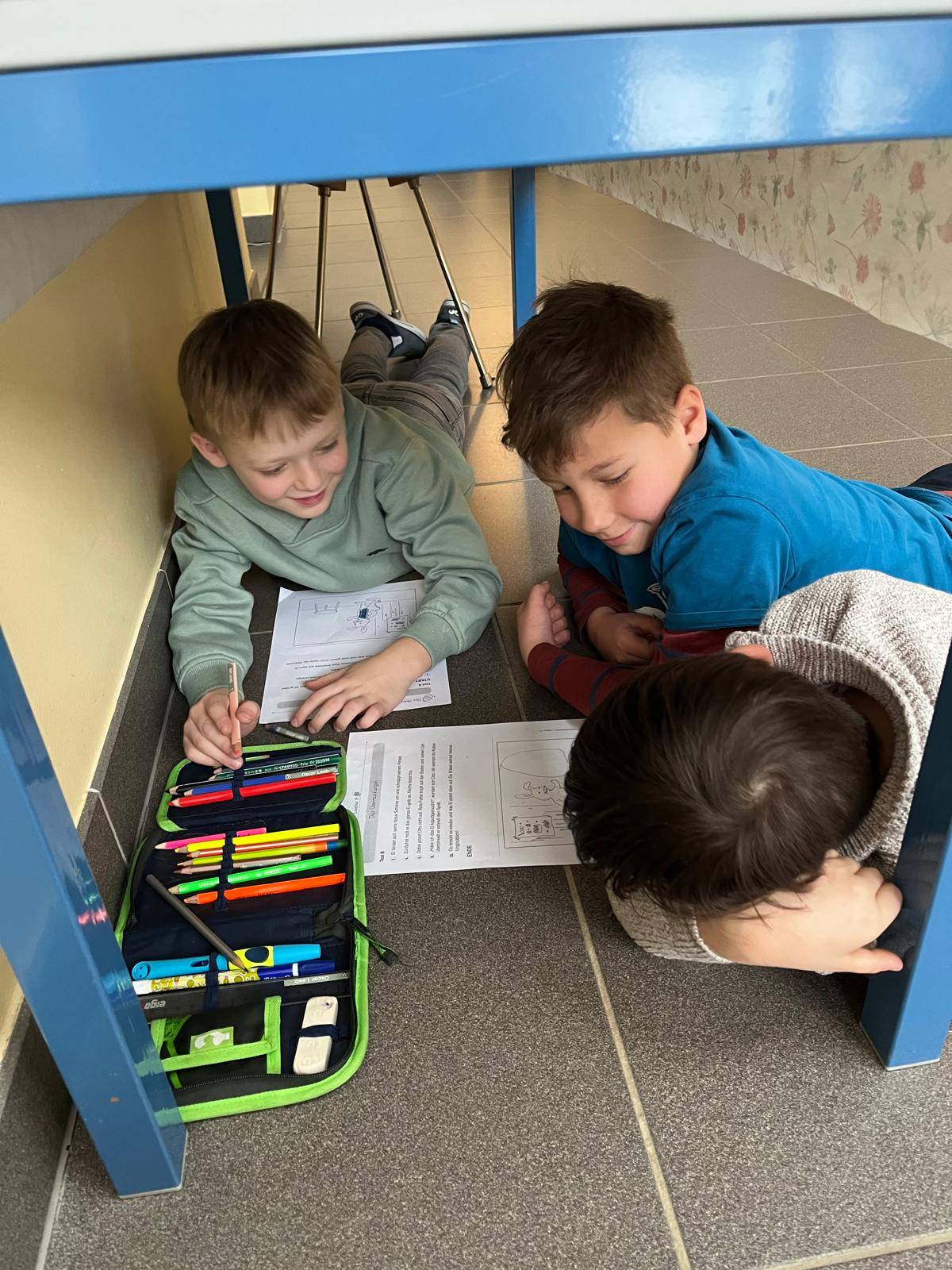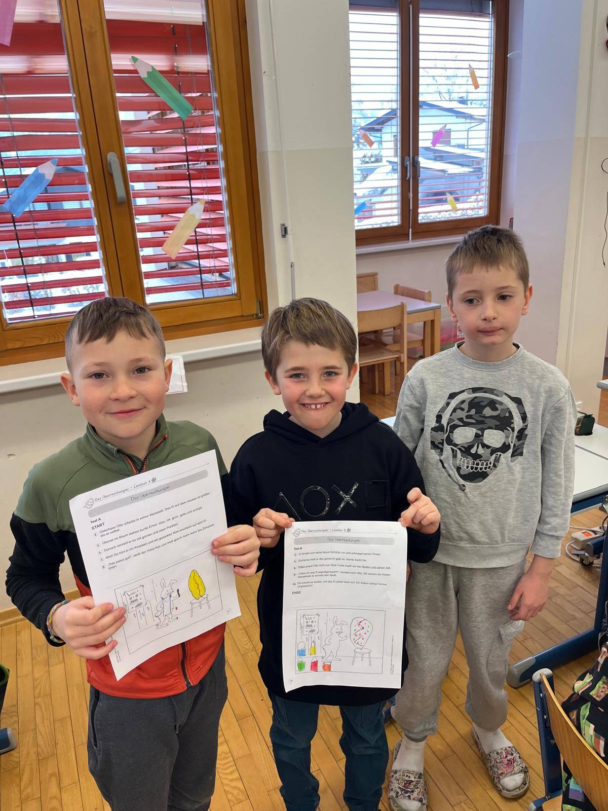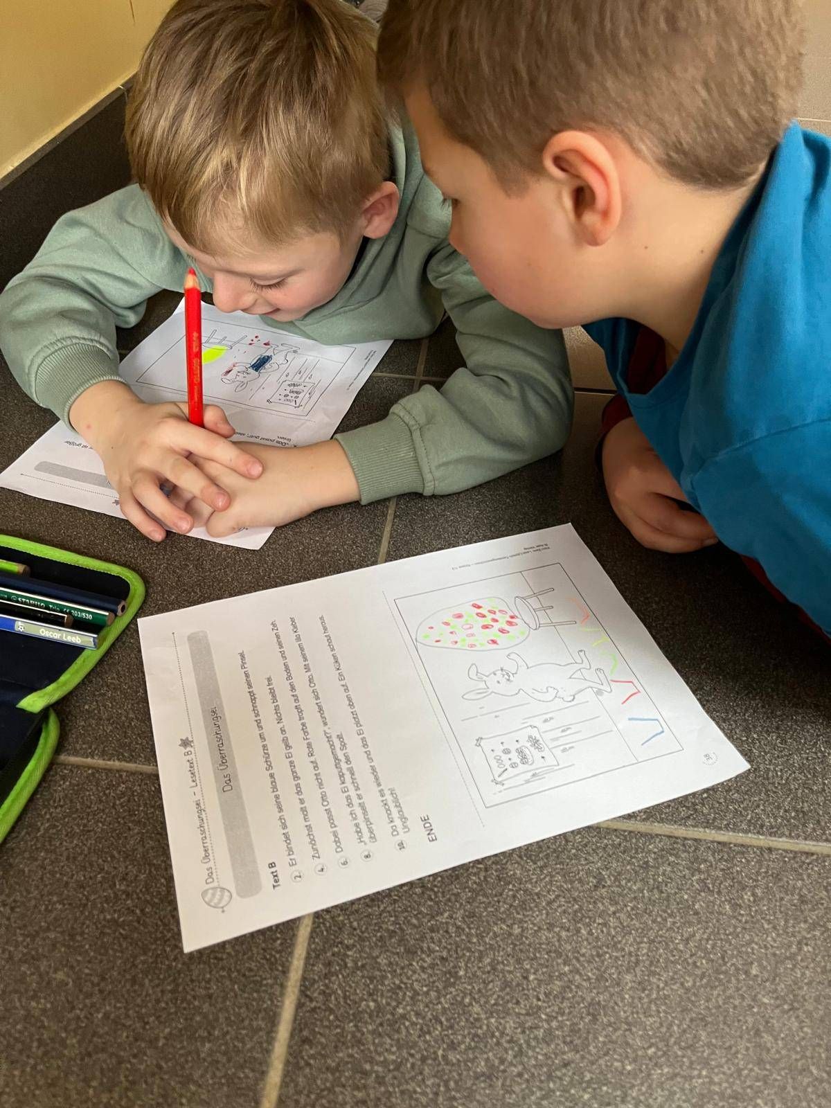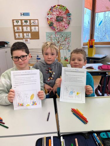 In der Leselauschgeschichte „Das Überraschungsei“ arbeiteten die Kinder in Partnerarbeit nach dem Prinzip der dialogischen Leseförderung. Während ein Schüler vorliest, konzentriert sich der Partner auf das Zuhören und visualisiert den Inhalt durch eine Zeichnung. Dieser Wechsel von auditiver und visuomotorischer Verarbeitung stärkt das Textverständnis, die Aufmerksamkeitsspanne sowie die sprachlich-kognitive Verknüpfung zwischen Hören, Verstehen und bildnerischem Ausdruck. Durch den anschließenden Rollentausch wird das Gelernte vertieft und die Perspektivübernahme gefördert.